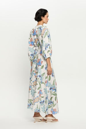 Azure is a bold floral, alive with striking blue blooms, terracotta accents and green leaves on a crisp white base. The Azure Maxi Dress is defined by its feminine V-neckline, button-through front and softly flared hem. Long sleeves with contrast mint detailing complete the look, a timeless silhouette designed for both everyday ease and elevated moments.