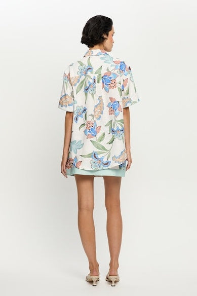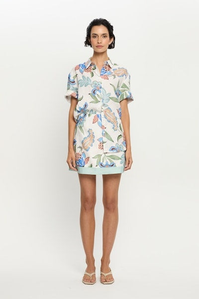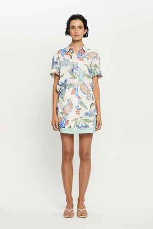 Azure is a bold floral, alive with striking blue blooms, terracotta accents and green leaves on a crisp white base. The Azure Shirt is a relaxed silhouette, featuring a button-through front with signature shell buttons and short sleeves framed by a contrast mint band. Wear with the matching Azure Mini Skirt for a coordinated set, or denim for a more refined look.