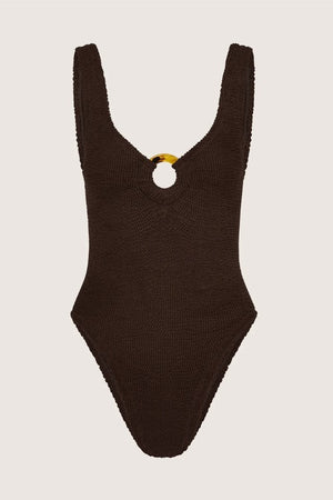 Modern swimsuit, timeless appeal. With tortoiseshell hoop detailing and a deep-v neckline, Celine has understated glamour down.