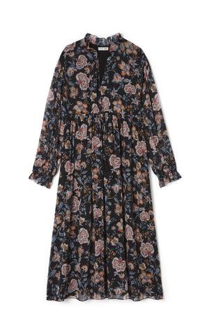 This utmost bohemian dress is made of 100% silk veil. Its voluminous sleeves and loose fit leave a bohemian perfume behind as you walk by.