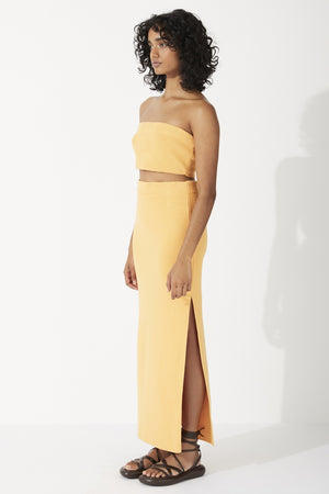 The Mandarin Organic Cotton Blend Knit Skirt by Zulu & Zephyr features a waisted fit with elasticated waistband, and a side split to mid thigh, in a sunny mandarin soft stretchy knit. Pair with the coordinating Mandarin Organic Cotton Bandeau Top.