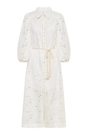 The Corfu Midi Dress is crafted from 100% cotton broderie in an intricate floral design. The dress features a button-through front with lace detail, 3/4 blouson sleeves, a rope waist tie and skirt side splits, with an accompanying slip providing extra coverage.