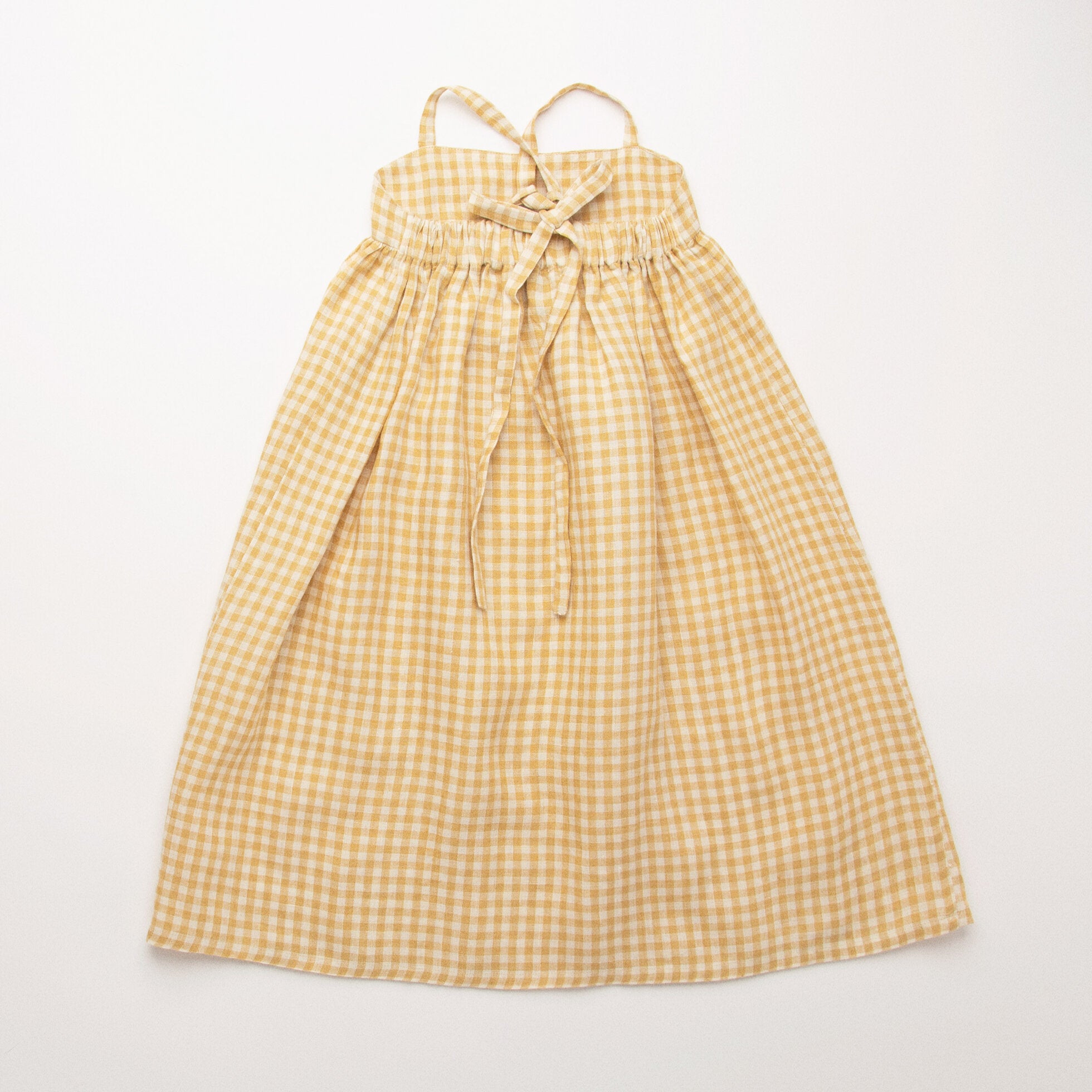 Floaty midi dress with fitted top, elasticated back and adjustable straps that tie through loops at the back. Skirt gathers at the chest to create a full, floaty style designed to sit at calf to ankle length. Perfect for layering over a blouse in the cooler weather and stripping back in the summer. Made from soft, hay check linen - a small scale warm cream check interwoven with a beautiful mustard yellow colour.