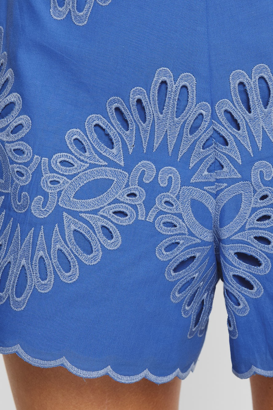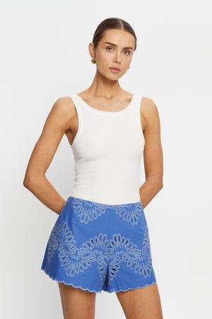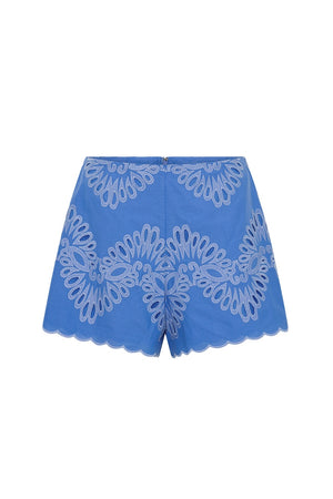The Danielle Short is a mid-rise silhouette crafted from blue cotton broderie, featuring a fitted waistband and a scalloped hem for a refined finish. Designed for light, effortless wear through warmer days. Style with the matching Danielle Top pair with a simple tank and sandals for relaxed weekend plans.