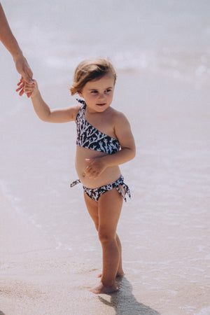 A chic one shoulder mini bandeau bikini with matching tie bottoms. Perfect for matching with mum.