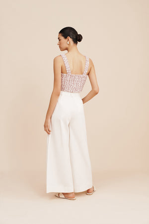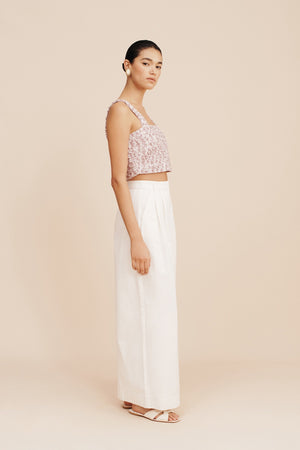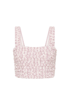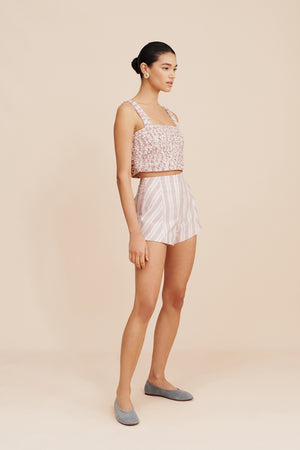 Woven from organic cotton handloom and patterned with vintage-inspired stripes, the Lena Top is adorned with delicate ruffles throughout. Designed in a cropped silhouette, it has adjustable straps to customise the fit.