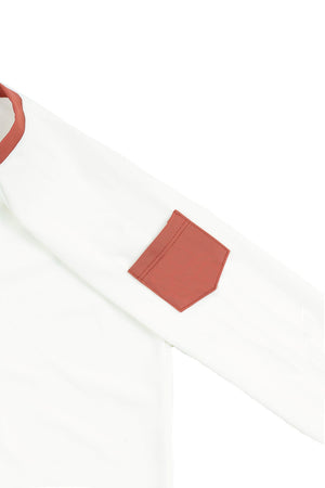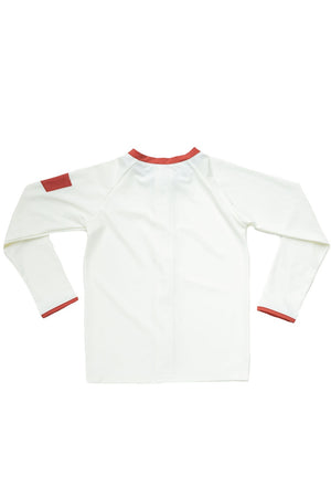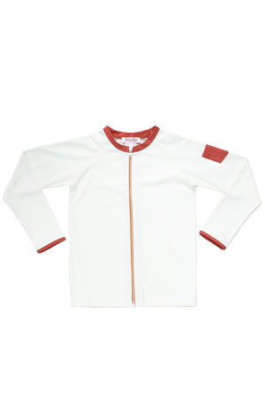 Traditional yet playful, the Leo rashguard in Ivory and Terracotta is a great way to protect your children from the sun harmful rays while keeping them looking stylish. The practical no-pinch flap and the multicolour full-length zip are elegant and fun.