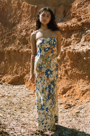 A statement strapless and body-skimming silhouette, The Maeve Dress from Soleil Soleil features an elasticated neckline and an effortless maxi length in the striking Kipos garden print. Loosely hand-painted with naive brushstrokes in an updated scale and palette.