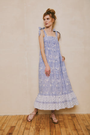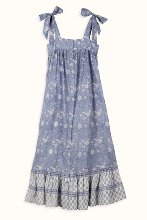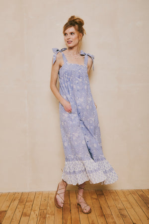 The Maisy is the perfect sundress shape from Ophelia & Indigo in the stunning blue floral border block print. With adjustable ties on the shoulder and a functioning button front. The subtle shaping of the top panel of the dress ensures that it sits well across the chest and neckline and the cut of the dress gives it a slight ‘swish’ when you walk.