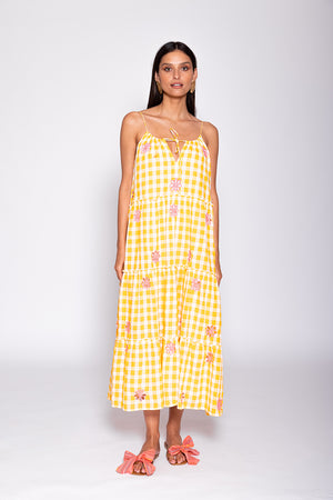 Entirely embellished by flower cuts highlighted by a pink topstitching. Spaghetti straps run along the back and become drawstring links on the front to adjust the dress. Made in a pretty gingham. the four gathered yokes create little flounces and bring lightness to movements. A separate belt can adjust the dress at your waist according to your moods.