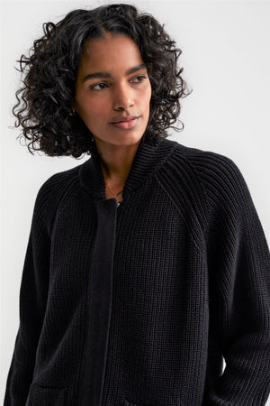 Produced in a flecked and chunky cotton rib knit with fashioned raglan sleeves, this loose-fitting, longline jacket offers great coverage. This style has a varsity collar, patch pockets and zips up the front.