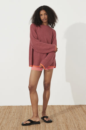 The Plum Contrast Rib Knit Jumper by Zulu & Zephyr features a round crew neckline, raglan long sleeve silhouette, and contrast rib detail on body and sleeve hem. This soft-touch rib will keep you warm and cosy for years to come. Layer over the Hallie Bikini for a warm beach cover up or on its own for a cosy look.