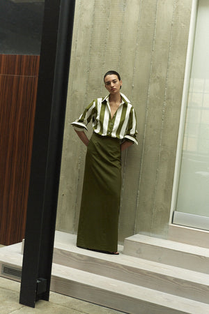 A signature shirt crafted from 100% cotton is made in a bespoke wide olive stripe.