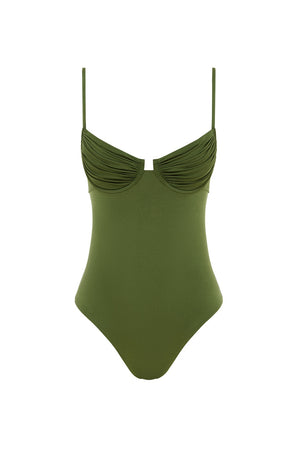 Introducing our Ruched Cup One Piece. Designed in a timeless Olivine hue, this modern silhouette features romantic ruching detail and underwire for a flattering fit. Complete with adjustable straps, a multi—back closure and open back for a luxurious finish.