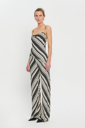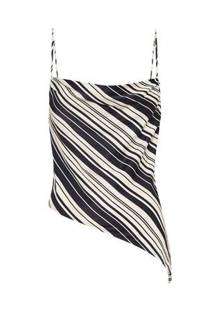 Sara is a vintage inspired, directional stripe in tonal hues of black and cream. The Sara Top is an asymmetric scarf top silhouette and features a straight neckline and straps that tie at the back, complete with a bias cut hemline. Pair with the Sara Pant to complete the look.