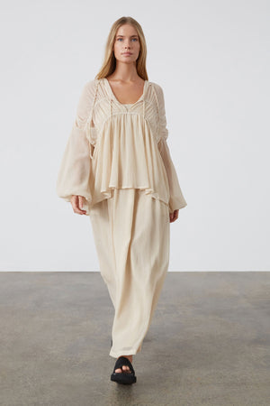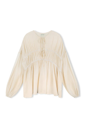 The Stone Sheer Textured Blouse is made from a luxurious blend of cotton and cupro offering a light, breathable feel. The sheer textured fabric creates a soft, ethereal look, enhanced by gathered panels along the body and voluminous long sleeves. The front ties at the neck allow for versatile styling, making this blouse perfect for layering over swimwear or pairing with casual bottoms for an effortless, chic look.