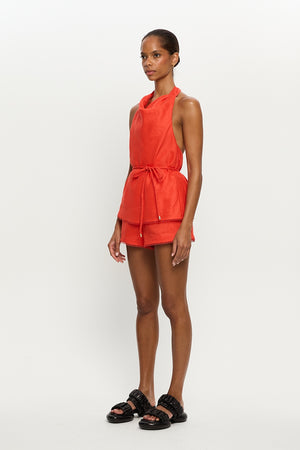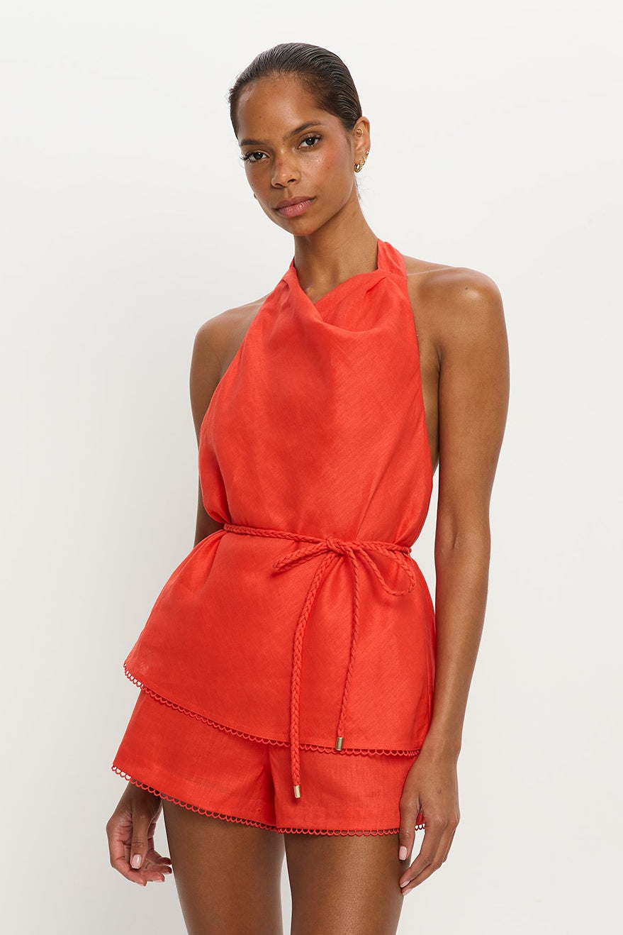 The Tara Top is crafted in a premium European Flax™ linen. The Tara Top features a high neckline with a soft cowl drape, a low open back and a scalloped hem, complete with a removable waist tie for versatile styling. Designed with refined femininity and ease, it's a modern silhouette that moves effortlessly from day to evening. Pair back with the Tara Short to complete the look.