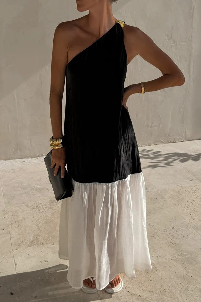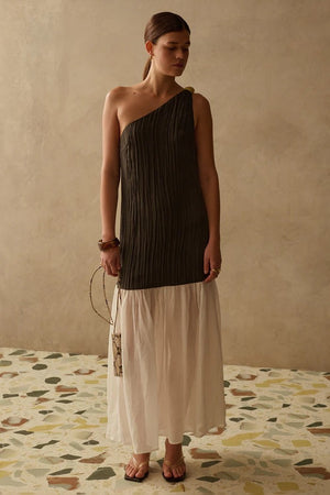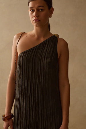 Making a statement with its asymmetric neckline, gold embellishment and sheer skirt panel, the Claudia Dress is a true embodiment of elegance and femininity.