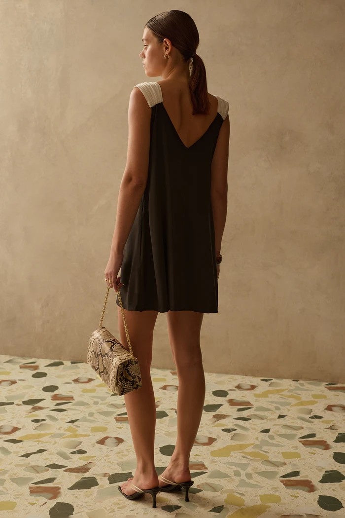 The Fia Dress is a floaty mini with distinct ruched straps, gold embellishments and v-neckline. Perfect for a daytime event with the ability to transition to night. A stunning dress to pair with knee high boots or some chic strappy heels.
