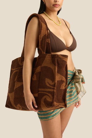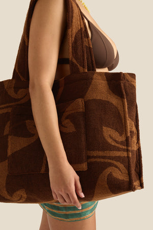 'Wave Umber' is a retro geometric design of rolling waves formed by abstract interlocking ’S’ shapes. Pair with the Towelling Pouch to complete the set.