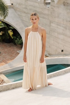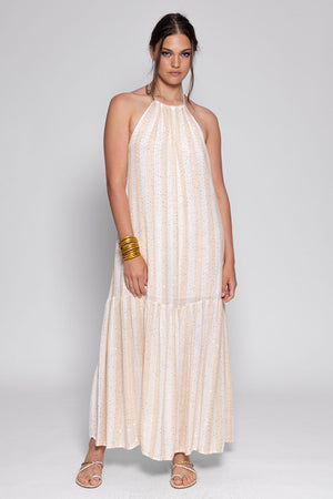 Entirely adorned by shiny yarns and sequins lines, Zahara long dress is made up of an open back and very indented armholes. This sleeveless dress has a drawstring link sublimed by pearled tassels that can be tied behind the head and creates gathers on the front. Slightly flared, a gathered part on the bottom brings lightness to movements.
